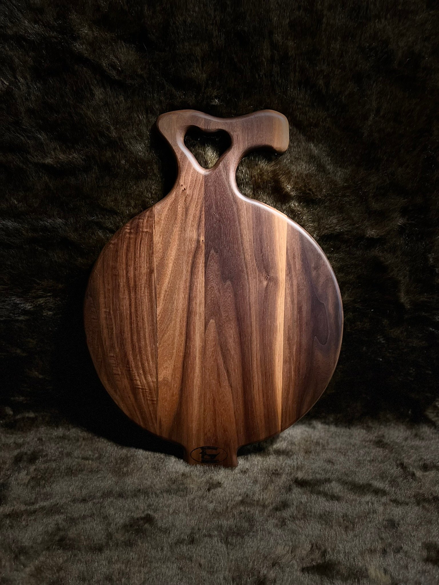 Beautiful black walnut or walnut and maple striped pizza boards, perfect for serving up a hot pizza or any other food you have in mind! 3/4" thick and multiple diameters available. Diameter sizes exclude handle. May not be 100% symmetrically circular in shape to maintain the authentic handmade feel. Due to grain pattern and color uniqueness of wood, no two boards will look identical. Actual board may vary from image. Use the Contact button if you have a specific handle in mind.