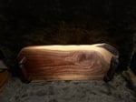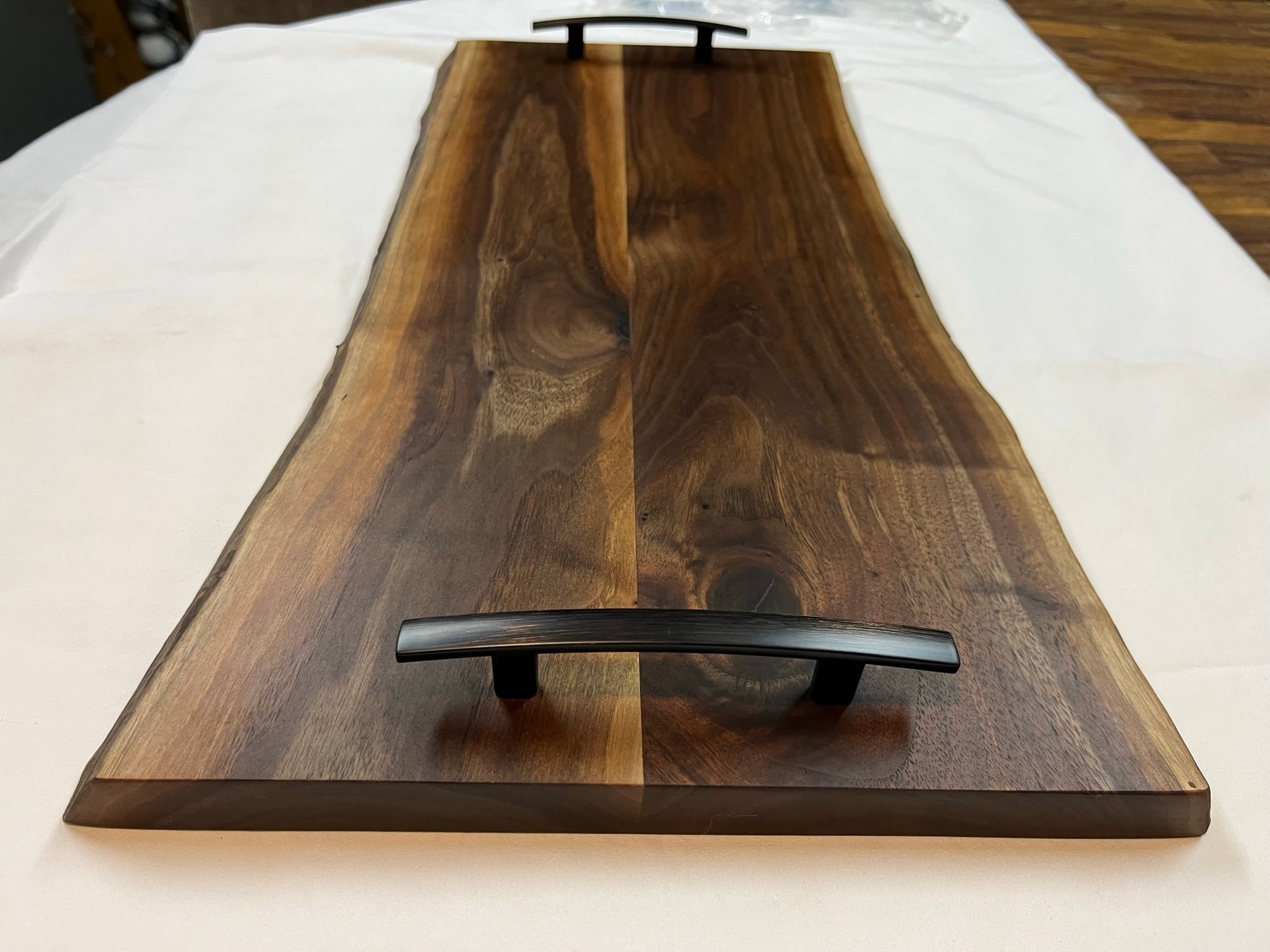 Black Walnut large serving trays with metal or hand-crafted wood handles. Typically, 3/4" thick 10"12" wide and 20"-24" long but customizable and able to be tailored to meet your desires. Use the "Contact" button and message me with customization ideas and handle preference. Boards are randomly shaped to compliment the flow of the natural wood grain. Due to grain pattern and color uniqueness of wood, no two cutting boards will look identical. Actual board may vary from image. All boards treated with food grade cutting board oil and conditioner.